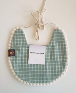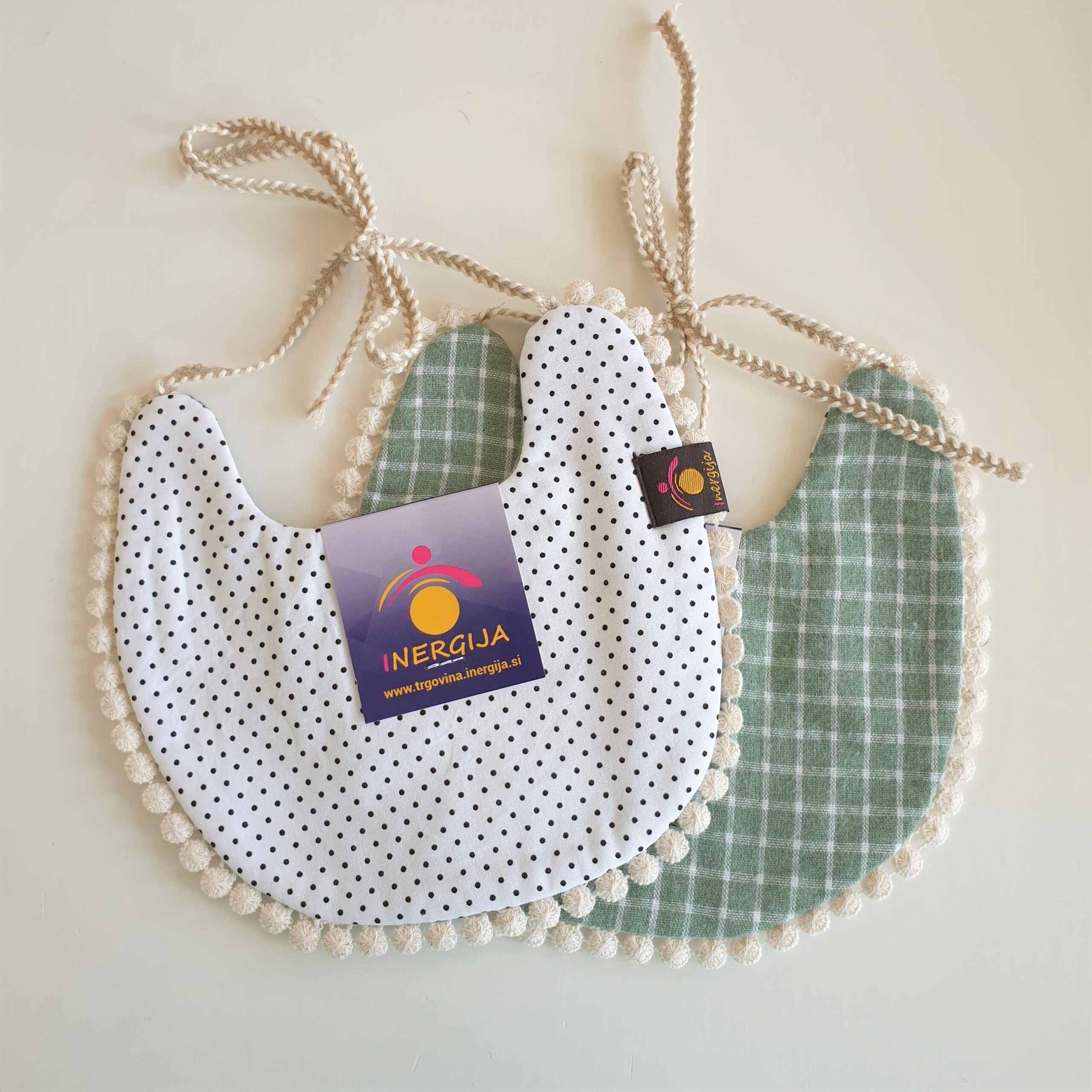 Otroški slinček iz Vintage Inergija kolekcije. Prefinjen izgled z obojestranskim dizajnom. Na eni strani občudujemo pridušeni zeleni karo, kot je od nekdaj v trendu na podeželskih dvorih, na drugi pa je bela z majcenimi črnimi pikicami, za lažje kombiniranje k različnim oblačilom. Pritrdimo ga s prepleteno vrvico, ki jo zavežemo na poljubni dolžini, zato je primeren za dojenčke 3 do 24 mesecev. Slinček odlično vpija vlago in ohranja dojenčkova oblačila suha in čista, obenem pa je zračen in lahek.